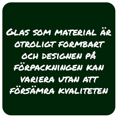 Fördelarna med glas som förpackningsmaterial är allmänt kända sedan länge. Det påverkar aldrig innehållets smak eller doft och är dessutom absolut tätt. Det är formbart och oändligt; det kan krossas och smältas om hur många gånger som helst utan att kvaliteten försämras. När återvunnet glas smälts om till nytt används 20 procent mindre energi än vid användning av nya råvaror. Visste du att glastillverkning med återvunnet glas släpper ifrån sig mindre mängd koldioxid?