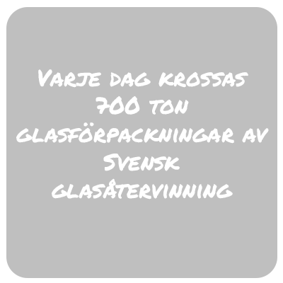 Sedan 1994 har Svensk Glasåtervinning haft ansvaret för att återvinna glasförpackningar i Sverige. Varje år hanterar företaget cirka 200 000 ton glas. Det mesta av det återvunna glaset skickas till skandinaviska glasbruk för att bli nya glasförpackningar. Andra produkter som görs av återvunnet glas är till exempel glasull och skumglas. Visste du att Sverige är bäst i världen på att återvinna glas? Vi återvinner hela 93 % av allt glas, vilket är väldigt imponerande!